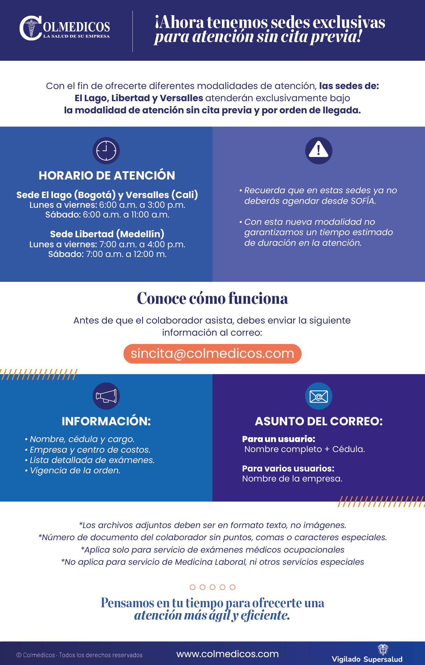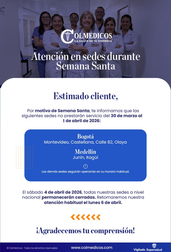 En Colmédicos somos una IPS con más de 35 años de experiencia en la prestación de servicios de salud en Colombia, consolidándonos como referentes en medicina laboral, exámenes médicos ocupacionales y programas de prevención en salud para el sector empresarial. Nuestro crecimiento ha sido posible gracias a un equipo humano de más de 600 profesionales de la salud, de los cuales más de 250 son médicos ocupacionales, altamente capacitados y con un sólido respaldo técnico y científico. En Colmédicos trabajamos día a día para garantizar servicios médicos de excelencia, respondiendo a las necesidades de cada empresa y contribuyendo al bienestar y productividad de tus trabajadores.